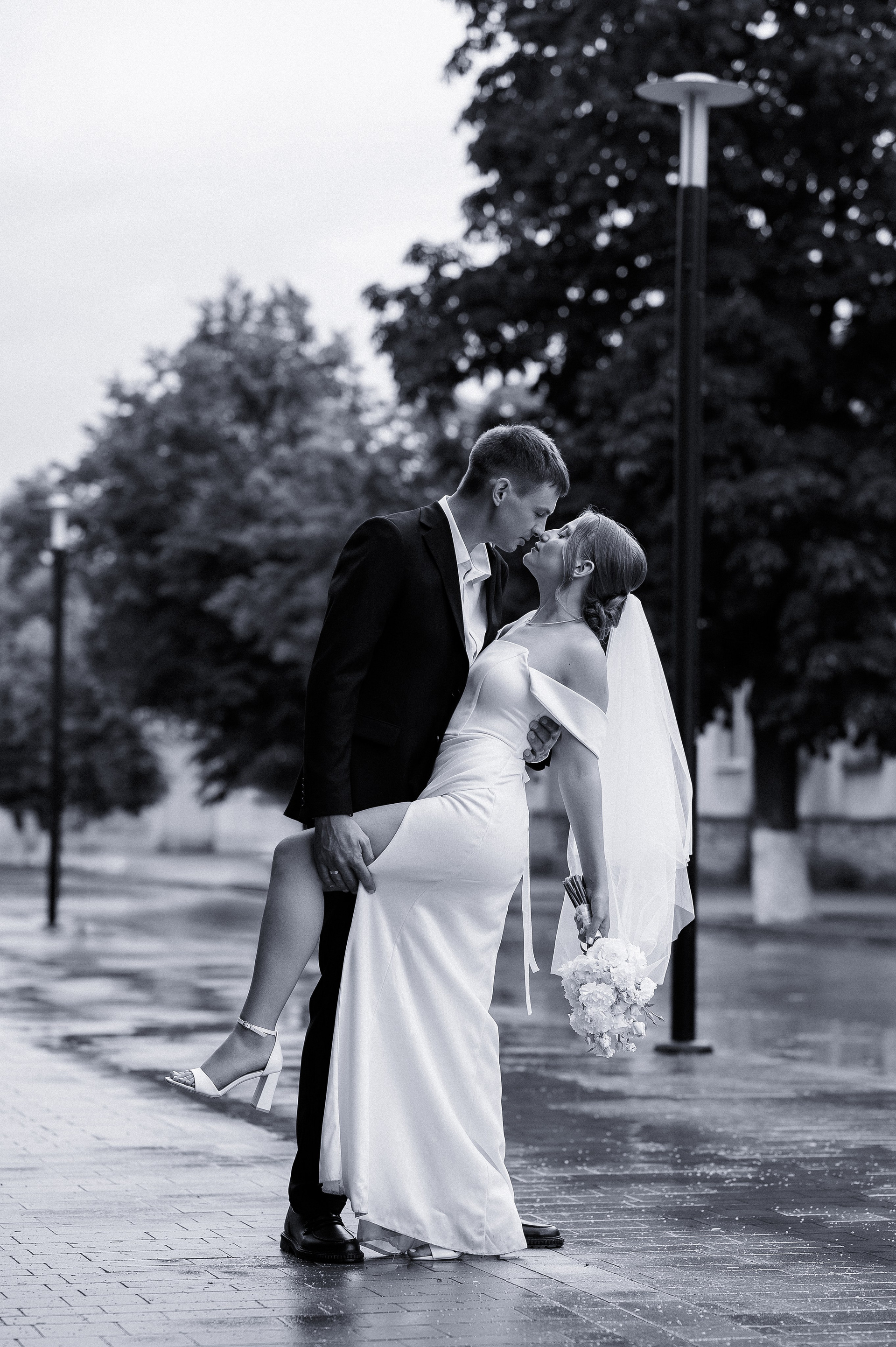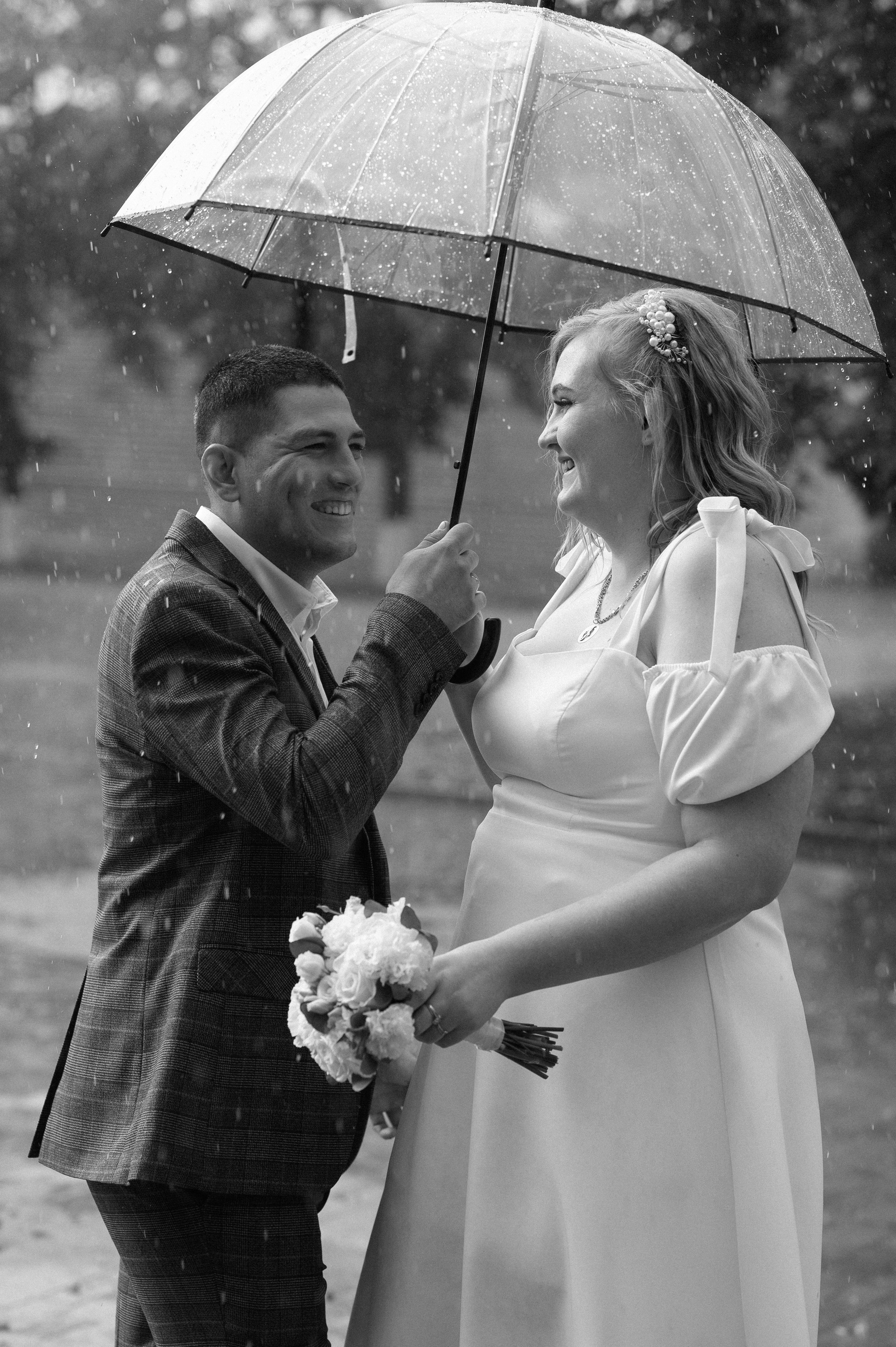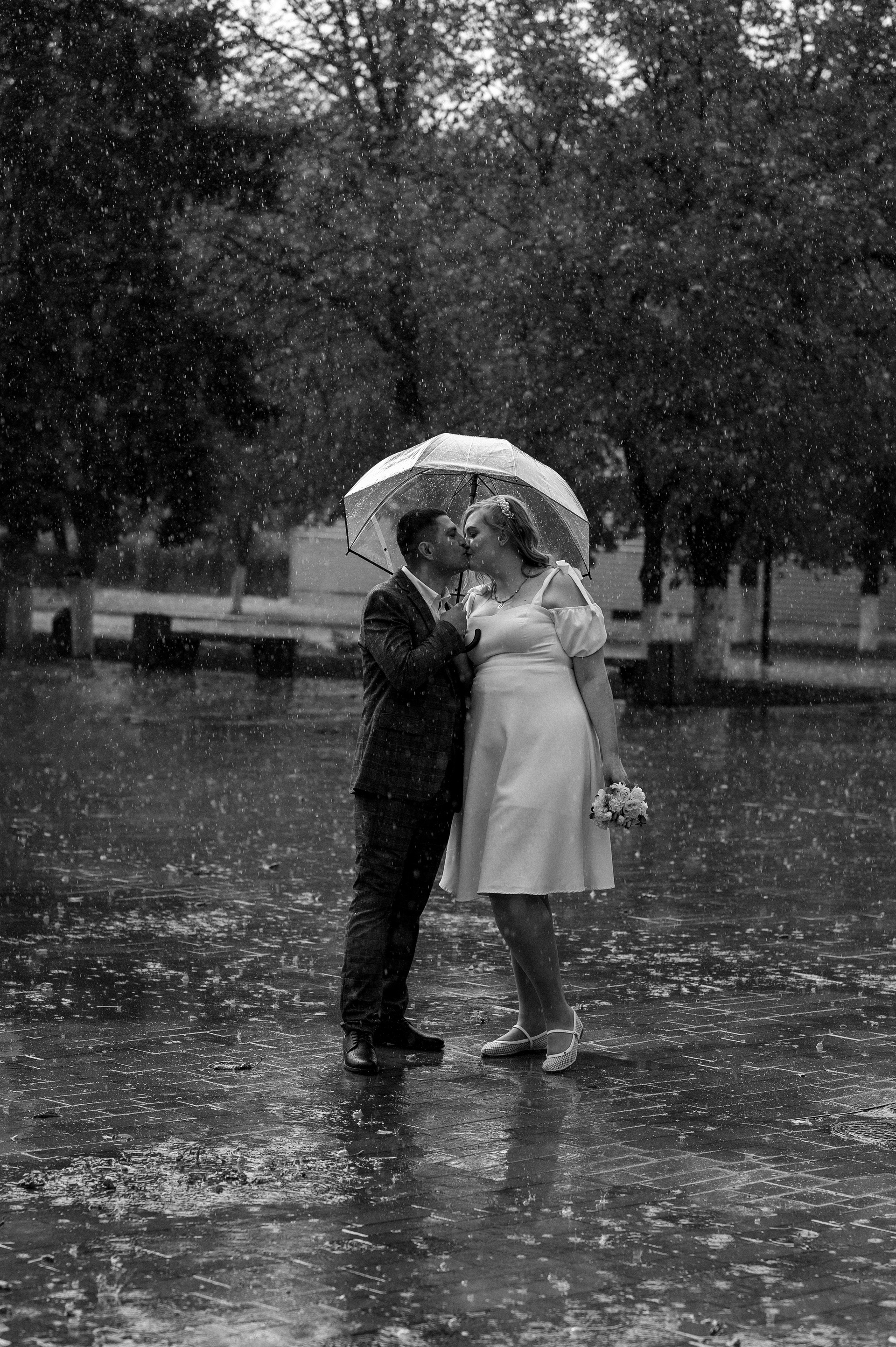 Умею находить красивый и интересный свет даже в яркое солнце, которое так не любит большинство фотографов. А на случай дождя имею прозрачные зонтики — они хорошо смотрятся в кадре, пропускают свет и вы можете быть спокойны. Так же имею свой профессиональный свет для съёмки банкета и сборов в отеле.